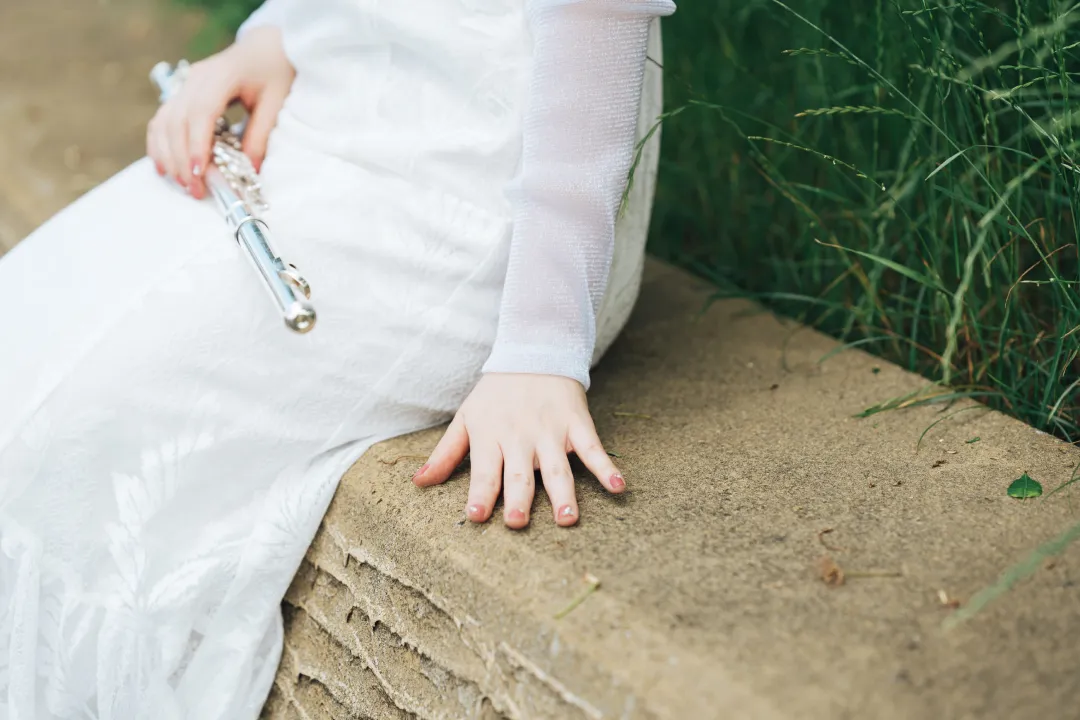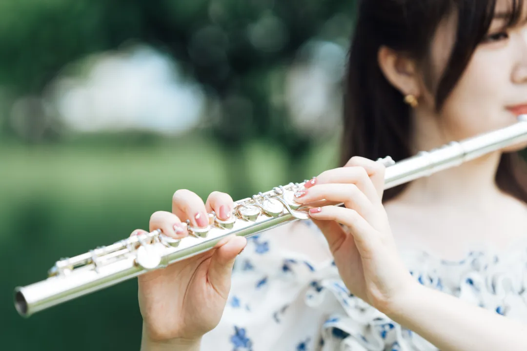 永田梨紗が一面に茂った緑の植物の前でフルートを持って柔らかな笑顔で立っているプロフィール写真